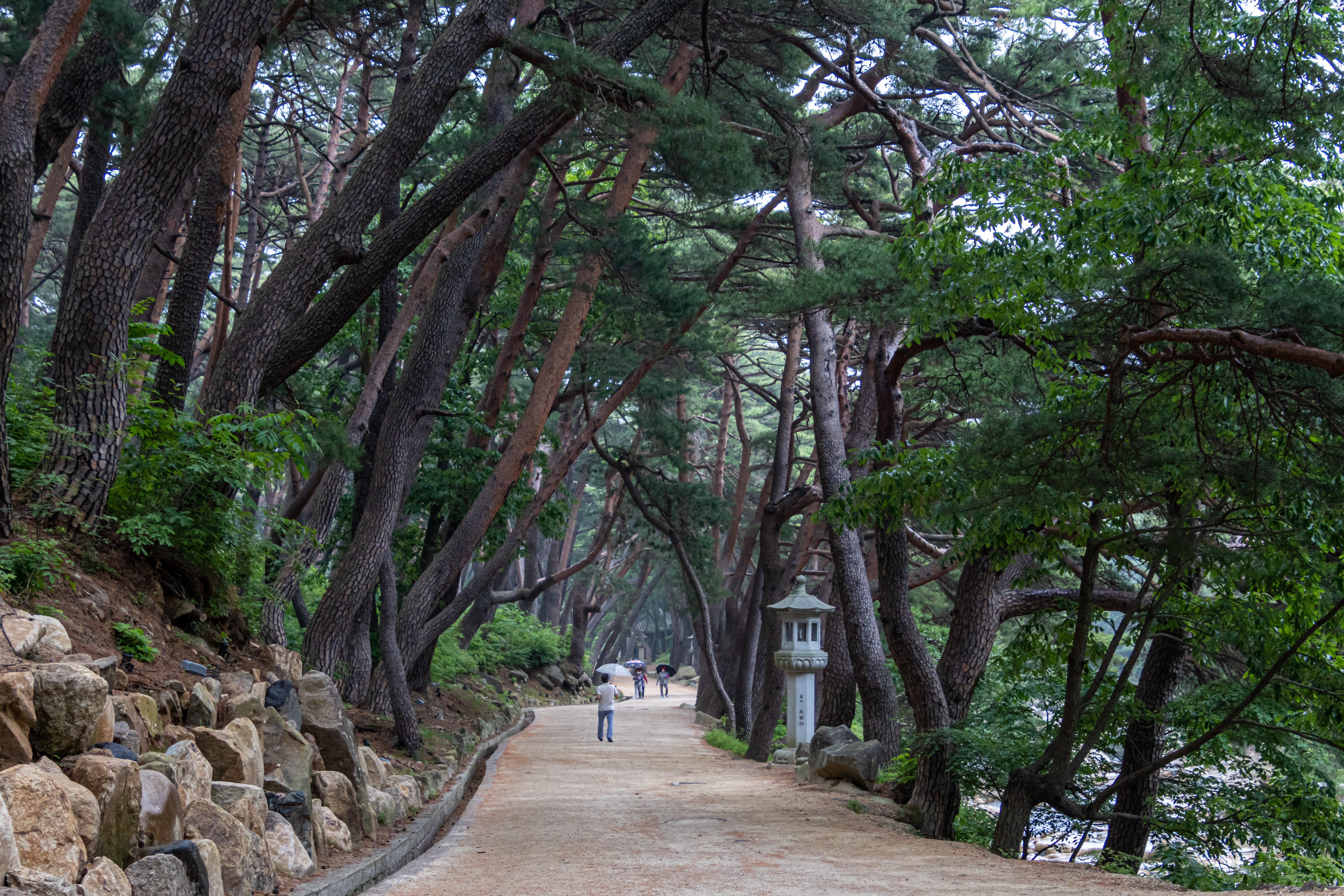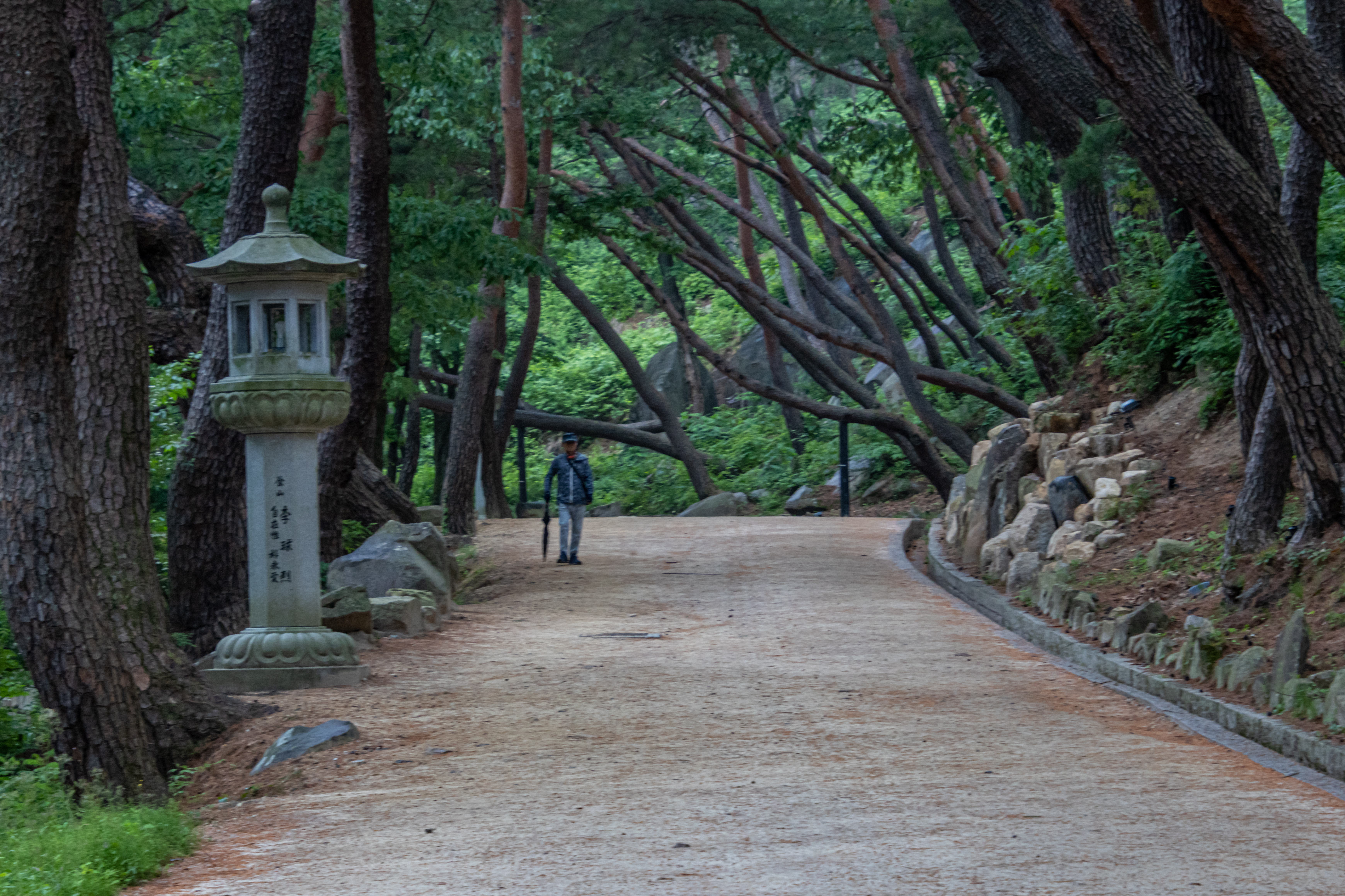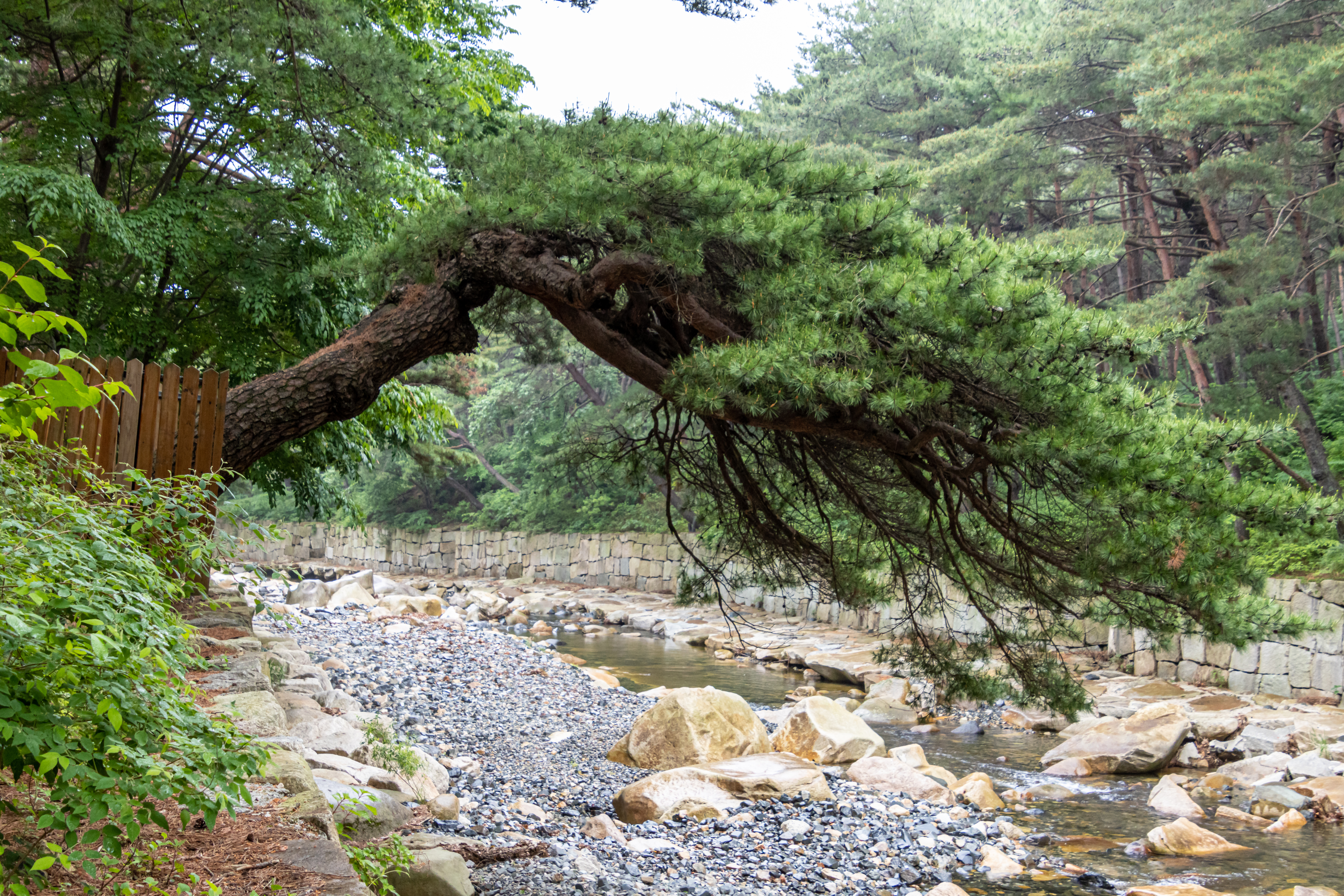내려오다가 석등과 석등 사이에 좌측에 굽어서 아름다운 소나무가 개울 쪽에 보인다.